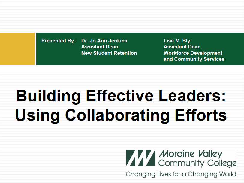 Building Effective Leaders – Using Collaboration Efforts Lisa M. Bly & Jo Ann Jenkins, Ph.D. League for Innovation in the Community College, Innovations 2010 March 28-31, 2010 – Baltimore, MD |